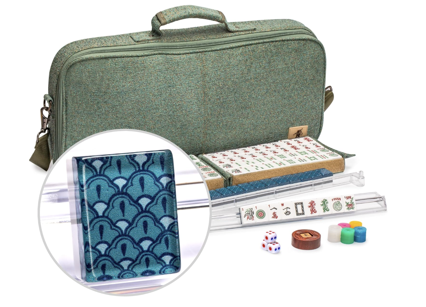 Traditional American Mahjong set with koi fish on the back. Includes tiles, racks, dice and carrying case.